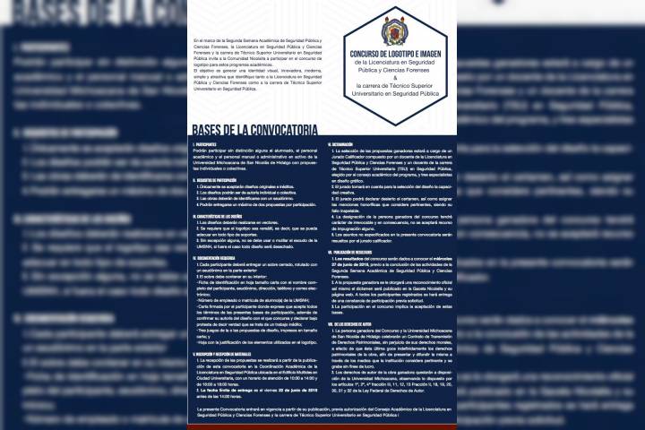 Con el objetivo de generar una identidad visual, innovadora, moderna, simple y atractiva, la Universidad Michoacana de San Nicolás de Hidalgo convoca a la comunidad nicolaita a participar en el concurso de diseño para el logotipo de la Licenciatura en Seguridad Pública y Ciencias Forenses y la carrera de Técnico Superior Universitario en Seguridad Pública.