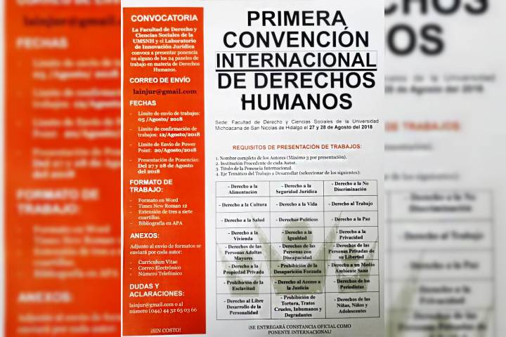 Dada la importancia de promover, proteger y garantizar los derechos y las libertades fundamentales de un individuo, sustentados en la dignidad humana sin distinción de nacionalidad, sexo, raza, religión o cualquier otra condición que marque una diferencia entre individuos o grupos, la Facultad de Derecho y Ciencias Sociales de la Universidad Michoacana de San Nicolás de Hidalgo, será la sede de la Primera Convención Internacional de Derec... Ver más...