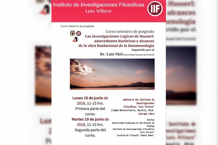 El Instituto de Investigaciones Filosóficas "Luis Villoro" de la Universidad Michoacana de San Nicolás de Hidalgo y la Facultad de Filosofía invitan a los estudiantes de maestría y doctorado a participar en el Curso Intensivo de Posgrado "Las Investigaciones Lógicas de Husserl: antecedentes históricos y alcances de la obra fundacional de la fenomenología".