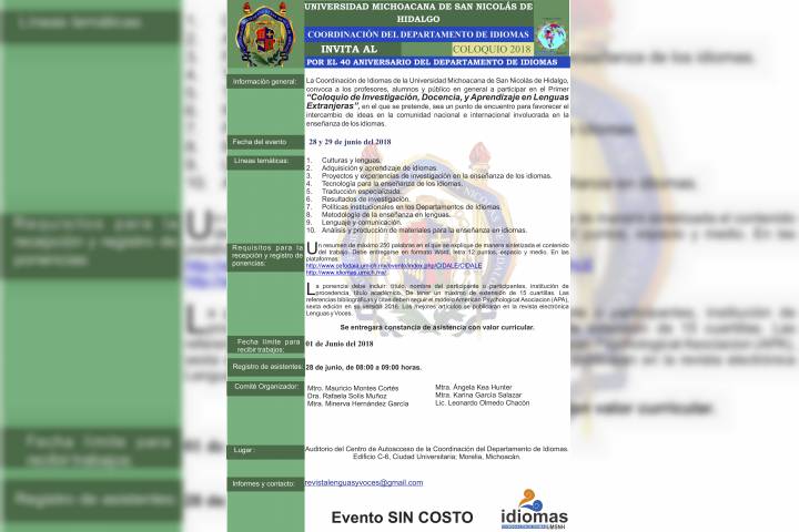 Con motivo de su 40 Aniversario, la coordinación del Departamento de Idiomas de la Universidad Michoacana de San Nicolás de Hidalgo, llevará a cabo a finales del presente mes el Primer "Coloquio de Investigación, Docencia, y Aprendizaje en Lenguas Extranjeras". Con la participación de profesores, estudiantes y público en general interesado en alguna lengua diferente al español, el evento es un punto de encuentro para favorecer el int...
