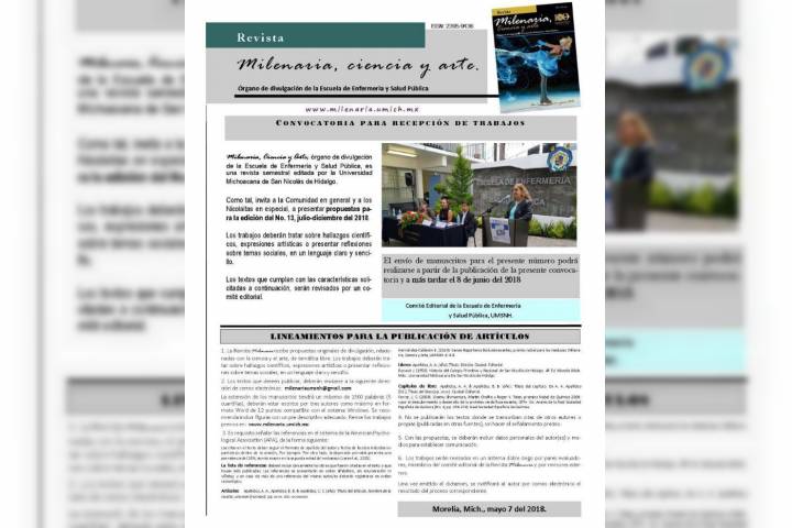 La Revista Milenaria, Ciencia y Arte, órgano de divulgación de la Escuela de Enfermería y Salud Pública de la Universidad Michoacana de San Nicolás de Hidalgo, presentó la nueva convocatoria para la recepción de trabajos de su publicación número 13 julio-diciembre del presente año.