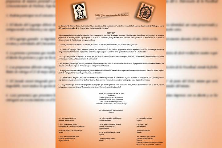 Con motivo de los festejos por su aniversario número cincuenta, la Facultad de Ciencias Físico Matemáticas "Mat. Luis Manuel Rivera Gutiérrez" de la Universidad Michoacana de San Nicolás de Hidalgo, invita a la comunidad de esta dependencia académica a participar en el concurso para elegir el Logotipo del Cincuentenario. Podrá participar en la convocatoria tanto personal académico como administrativo, estudiantes y egresados de la Fa...
