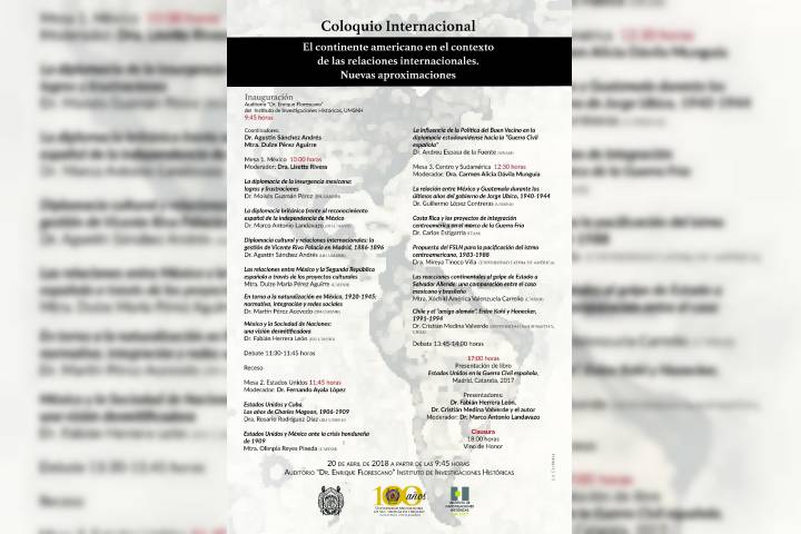 Bajo la coordinación de los historiadores nicolaitas AgustÃn Sánchez Andrés y Dulze Pérez Aguirre, este jueves se llevará a cabo el Coloquio Internacional "El continente americano en el contexto de las relaciones internacionales. Nuevas aproximaciones", en el Instituto de Investigaciones Históricas de la Universidad Michoacana de San Nicolás de Hidalgo.