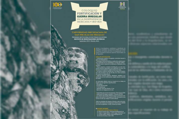 El Instituto de Investigaciones Históricas de la Universidad Michoacana de san Nicolás de Hidalgo, a través del Programa Institucional de Doctorado en Historia, invita a la comunidad universitaria interesada a participar con ponencias, en el Coloquio "Fortificación y Guerra Irregular en la Independencia Mexicana, 1810-1825".