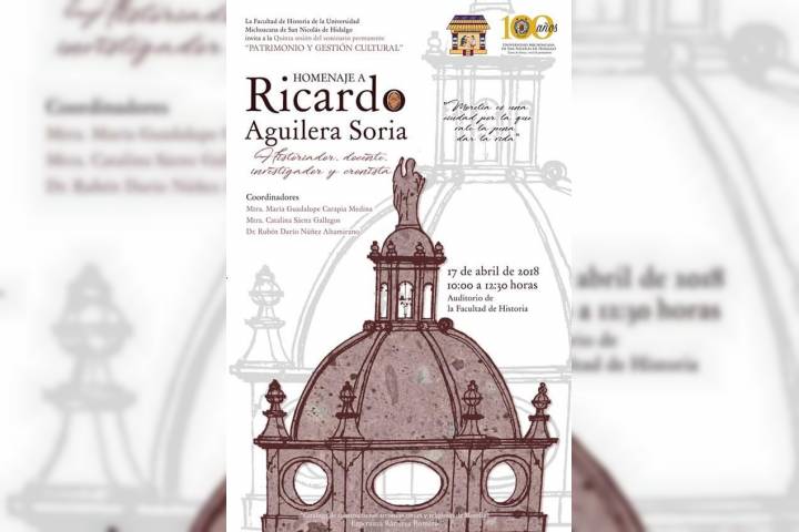 La Facultad de Historia de la Universidad Michoacana de San Nicolás de Hidalgo invita a la comunidad universitaria a la Quinta sesión del Seminario permanente "Patrimonio y gestión cultural", donde se realizará un homenaje a Ricardo Aguilera Soria, reconocido historiador, docente, investigador y cronista nicolaita, fallecido en el año 2017.