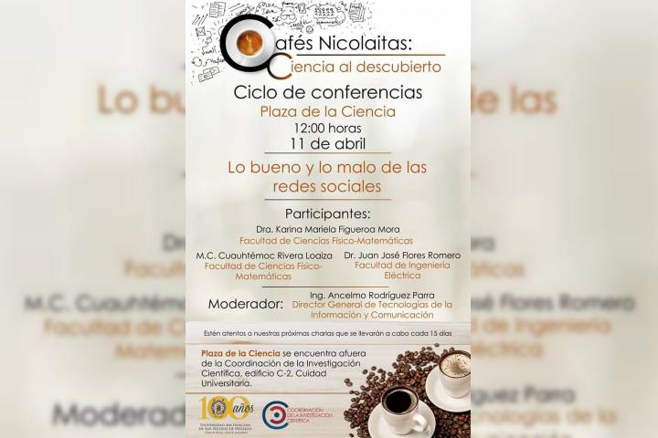 NOTICIAS 09/04/2018Las bondades y perjuicios de las redes sociales, tema del Café Nicolaita esta semanaEn continuidad con el programa de divulgación científica denominado: Cafés Nicolaitas: Ciencia al descubierto, esta semana la Universidad Michoacana de San Nicolás de Hidalgo presenta el tema "Lo bueno y lo malo de las redes sociales".