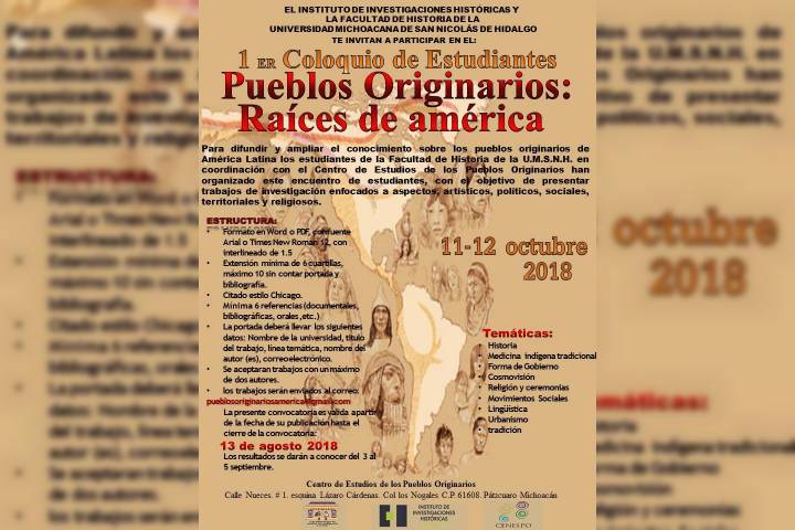 La Facultad de Historia y el Centro Nicolaita de Estudios de los Pueblos Originarios, de la Universidad Michoacana de San Nicolás de Hidalgo, invitan a la comunidad estudiantil michoacana a participar en el Primer coloquio de estudiantes: Pueblos originarios: raíces de América.