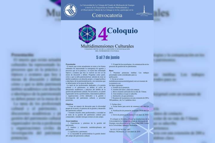 Ante el interés que existe actualmente en torno a los bienes culturales y preguntas sobre quién, cómo y qué es lo que se debe patrimonializar, la Universidad Michoacana de San Nicolás de Hidalgo invita a la comunidad nicolaita interesada, a participar en la convocatoria para presentar ponencias y estudios de investigación en el 4º Coloquio Multidimensiones Culturales. Visiones crÃticas de la gestión e investigación del Patrimonio Cult... Ver más...