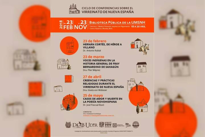 La Universidad Michoacana de San Nicolás de Hidalgo invita al ciclo de conferencias sobre el Virreinato de la Nueva España, que tendrá como sede la Biblioteca Pública Universitaria, evento académico organizado en coordinación con la ENES-UNAM campus Morelia, el Conservatorio de las Rosas y la Unidad de Investigación sobre Representaciones Culturales y Sociales (UDIR).