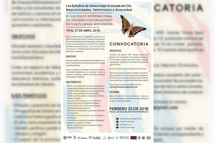 NOTICIAS 15/02/2018Invitan a nicolaitas a participar en Coloquio Internacional de Jóvenes Historiadores La Universidad Michoacana de San Nicolás de Hidalgo, a través de la Facultad de Historia, invita a los estudiantes nicolaitas de la licenciatura y carreras afines, a participar con sus avances de tesis en materia de género en el 8º Coloquio Internacional de Jóvenes Historiadores que se llevará a cabo en Tlalpujahua, Michoacán.