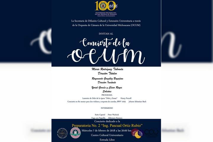 La Universidad Michoacana de San Nicolás de Hidalgo a través de su Secretaría de Difusión Cultural y Extensión Universitaria, invita al concierto que ofrecerá la Orquesta de Cámara de la Universidad Michoacana (OCUM), dentro del ciclo de los festejos del Centenario de la Casa de Estudios.