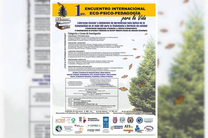NOTICIAS 06/02/2018Convoca UMSNH al 1er Encuentro Internacional "Eco-Psico-Pedagogía para la vida" La Universidad Michoacana de San Nicolás de Hidalgo invita a la comunidad universitaria en general, a participar en el 1er Encuentro Internacional "Eco-Psico-Pedagogía para la vida" a realizarse este mes de febrero con el tema: Liderazgo Escolar y Ambientes de Aprendizaje bajo óptica de la complejidad en el siglo XXI para la ciudadanía y servicio de calidad.