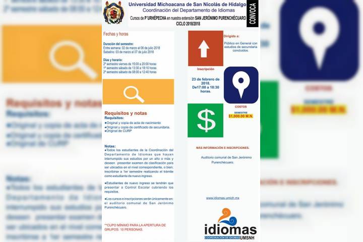La Universidad Michoacana de San Nicolás de Hidalgo a través de la Coordinación del Departamento de Idiomas pone a disposición de la comunidad universitaria y público en general, cursos de lengua Purhépecha para el presente ciclo escolar en las localidades de Pátzcuaro y San Gerónimo Purenchécuaro.