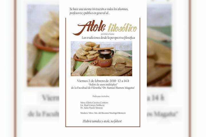 Para ahondar en el pensamiento prehispánico mexicano, así como la cultura surgida desde la tradición católica, la Facultad de Filosofía de la Universidad Michoacana de San Nicolás de Hidalgo invita a sus alumnos y público interesado en el análisis de las costumbres mexicanas en el evento "Atole Filosófico".