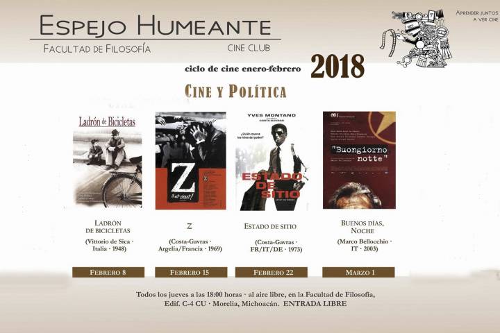 La Facultad de Filosofía de la Universidad Michoacana de San Nicolás de Hidalgo presenta el ciclo de cine "Espejo Humeante", para alumnos y público interesado; las presentaciones se llevarán a cabo los días jueves.