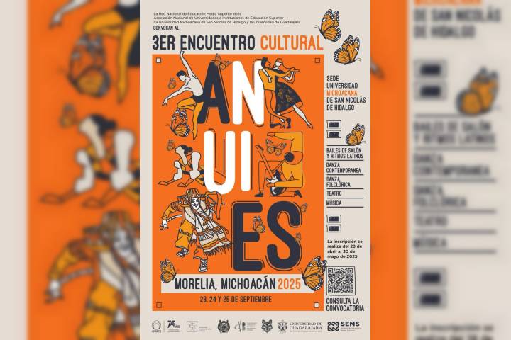 NOTICIAS 08/04/2025Instituciones de educación media superior mostrarán riqueza artística en el 3er Encuentro Cultural ANUIESLa Universidad Michoacana de San Nicolás de Hidalgo (UMSNH) será la sede del 3er Encuentro Cultural ANUIES que se llevará a cabo el próximo mes de septiembre, con la participación de estudiantes de instituciones que conforman la Red Nacional de Educación Media Superior (RNEMS) de la Asociación Nacional de Universidades e Instituciones de Educación Superior (ANUIES).