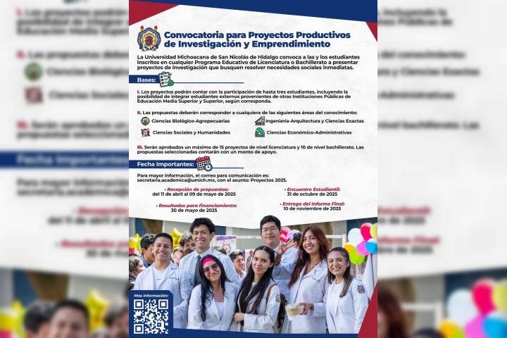 NOTICIAS 13/04/2025Administración de Yarabí Ávila lanza convocatoria para proyectos de investigación para estudiantesPor segundo año consecutivo la administración de la rectora de la Universidad Michoacana de San Nicolás de Hidalgo (UMSNH), Yarabí Ávila González, lanzó la convocatoria para que estudiantes de licenciatura y bachillerato de la institución participen con proyectos de investigación y de emprendedorurismo que busquen resolver necesidades sociales.