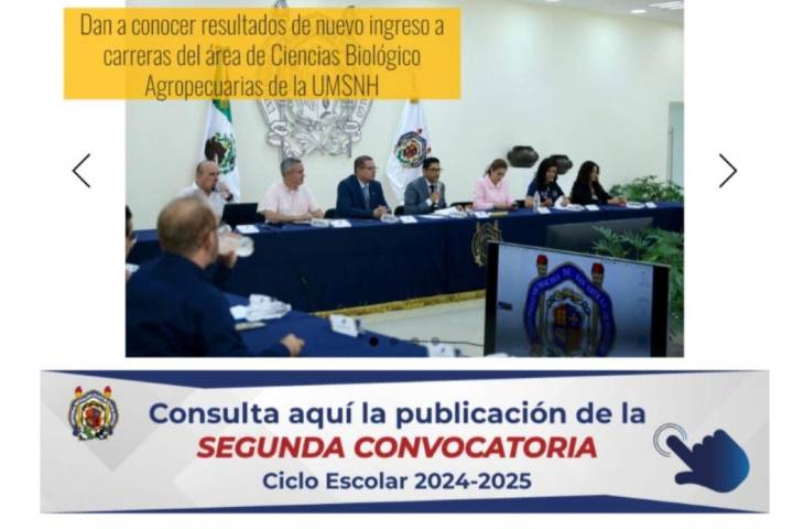 NOTICIAS 17/06/2024El 21 de junio abre la UMSNH segunda convocatoria de nuevo ingreso, anuncia rectora Este viernes 21 de junio, la Universidad Michoacana de San Nicolás de Hidalgo (UMSNH) abrirá la segunda convocatoria de nuevo ingreso, anunció la rectora Yarabí Ávila González.