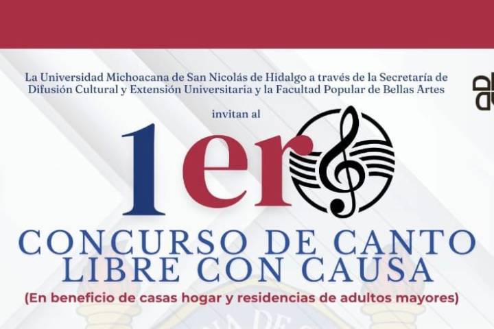 NOTICIAS 11/05/2024Muestra tu talento, participa en el 1er Concurso de Canto Libre con Causa de la UMSNH Si eres estudiante nicolaita y te gusta cantar y ayudar, la Universidad Michoacana de San Nicolás de Hidalgo (UMSNH) te invita a participar en el 1er Concurso de Canto Libre con Causa, que será en beneficio de casas hogar y residencias de adultos mayores, el cual se desarrollará el próximo 22 de mayo a las 9:00 horas en el Auditorio Universitario "Samuel Ramos", para celebrar el "Día del Estudiante".