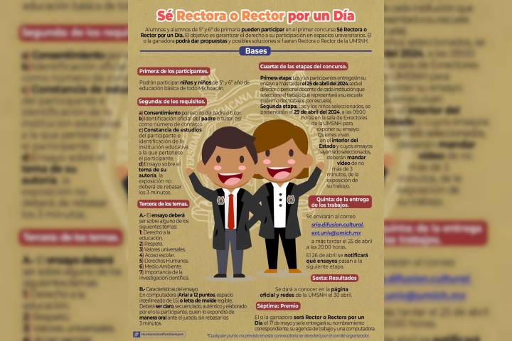 NOTICIAS 22/04/2024¿Quieres ser rectora o rector de la UMSNH por un día?, niñas y niños podrán participar en el concurso que realiza la UMSNH ¿Quieres convertirte en rectora o rector de la Universidad Michoacana de San Nicolás de Hidalgo por un día?, todas las niñas y niños que estudian quinto y sexto de primaria están invitados/as a participar en el primer concurso de este tipo que organiza la institución.