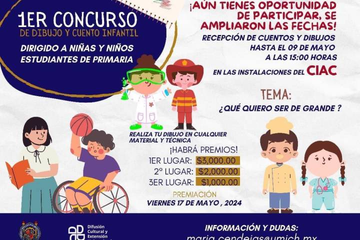 NOTICIAS 30/04/2024UMSNH amplia fecha para que las y los niños participen en los concursos "Sé rector o rectora por un día" y de Dibujo y Cuento InfantilLas y los niños estudiantes de primaria que quieran participar en los concursos "Sé rector o rectora por un día" y de Dibujo y Cuento Infantil que organiza la Universidad Michoacana de San Nicolás de Hidalgo (UMSNH), aún tienen tiempo de enviar sus trabajos, la convocatoria amplió el plazo para el 13 y 9 de mayo, respectivamente.