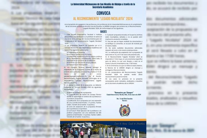 NOTICIAS 03/03/2024Por primera vez, la UMSNH entregará el Reconocimiento "Legado Nicolaita" Por primera ocasión, la Universidad Michoacana de San Nicolás de Hidalgo (UMSNH) entregará el Reconocimiento "Legado Nicolaita" 2024, como una forma de reconocer a las profesoras y profesores en el cumplimiento de las funciones sustantivas de la institución.