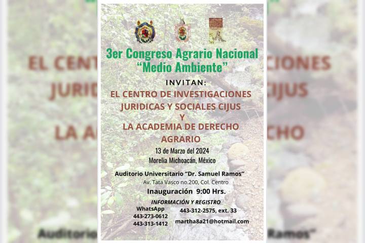 NOTICIAS 10/03/2024Medio ambiente, tema principal del Congreso Agrario Nacional El medio ambiente será el tema principal a abordar en el tercer Congreso Agrario Nacional organizado por el Centro de Investigaciones Jurídicas y Sociales (CIJUS) de la Facultad de Derecho y Ciencias Sociales de la Universidad Michoacana de San Nicolás de Hidalgo (UMSNH) y la Academia de Derecho Agrario, que se realizará el próximo 13 de marzo.