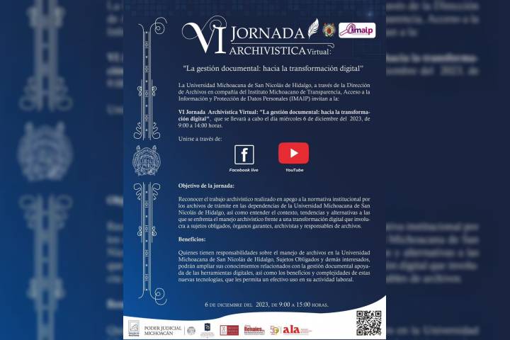 NOTICIAS 04/12/2023En puerta, VI Jornada Archivística de la UMSNH; aún puedes inscribirte Con la participación de ponentes nacionales e internacionales se realizará la VI Jornada Archivística virtual bajo el contexto "La gestión documental: hacia la transformación digital", que se llevará a cabo este 6 de diciembre, organizada por la Universidad Michoacana de San Nicolás de Hidalgo (UMSNH) a través de la Dirección de Archivos en coordinación con el Instituto Michoacano de la Transparencia, Acceso a la Información y Protecci... Ver más...