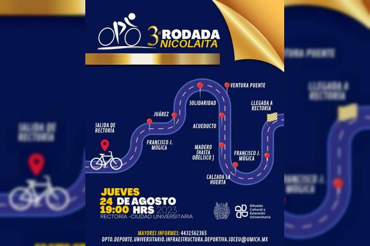NOTICIAS 24/08/2023Hoy se realizará la tercera Rodada Ciclista Nicolaita, la UMSNH invita a toda la población a participar Hoy en punto de las 19:00 horas dará inicio la tercera Rodada Ciclista Nicolaita, que organiza la Universidad Michoacana de San Nicolás de Hidalgo (UMSNH), todas y todos están invitados a pedalear esta noche.