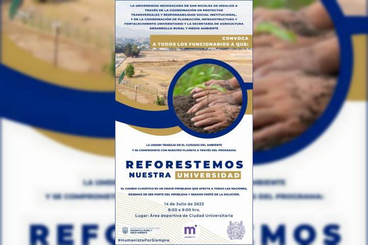 NOTICIAS 10/07/2023UMSNH realizará la jornada "Reforestemos nuestra Universidad" Refrendando el compromiso con el cuidado del medio ambiente, la Universidad Michoacana de San Nicolás de Hidalgo (UMSNH) realizará la jornada "Reforestemos nuestra Universidad", en la que estará participando el funcionariado, trabajadoras y trabajadores nicolaitas, así como directoras y directores de facultades e Institutos.