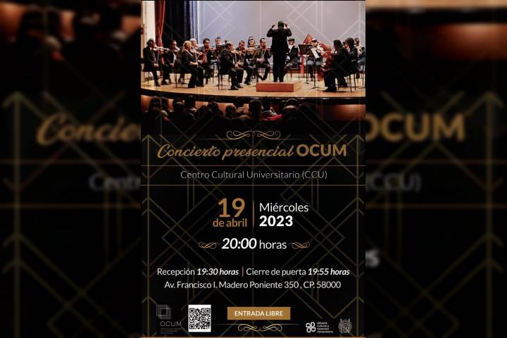 NOTICIAS 18/04/2023Todas y todos están invitados al concierto presencial de la OCUMTodas y todos están invitados al concierto presencial que ofrecerá la Orquesta de Cámara de la Universidad Michoacana (OCUM), que se llevará a cabo este miércoles 19 de abril, en punto de las 20:00.