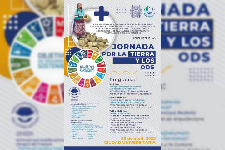 NOTICIAS 19/04/2023UMSNH realizará la Jornada por la Tierra y los Objetivos de Desarrollo Sostenible La Universidad Michoacana de San Nicolás de Hidalgo (UMSNH) realizará este 20 de abril, la Jornada por la Tierra y los Objetivos de Desarrollo Sostenible (ODS), en la que se llevarán a cabo diversas actividades como el Tianguis del Trueque Mojtakuntani, una conferencia magistral y diversos talleres.