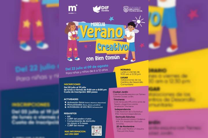 El Gobierno de Morelia, que encabeza el Presidente Alfonso Martínez Alcázar, invita a todas las familias a inscribir a sus hijos e hijas en el programa "Verano Creativo con Bien Común". Este programa, que se llevará a cabo del 22 de julio al 09 de agosto, está diseñado para ofrecer a los pequeños, actividades como manualidades, dibujo, activación física y reforestación, a través de la Secretaría de Bien Común y Política Social. ...