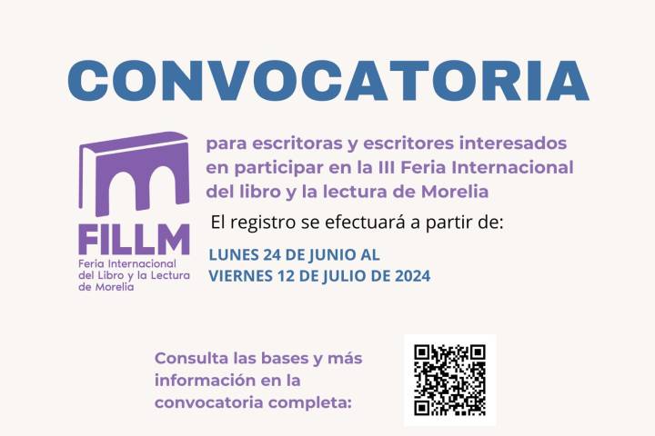 NOTICIAS 26/06/2024Ayuntamiento de Morelia lanza tres convocatorias para la Feria Internacional del Libro y la Lectura de Morelia El Ayuntamiento de Morelia, que encabeza el Alcalde, Alfonso MartÃnez Alcázar, lanzó desde la SecretarÃa de Cultura (SeCultura) tres convocatorias para que las personas vinculadas al mundo editorial puedan participar en la siguiente Feria Internacional del Libro y la Lectura de Morelia (FILLM), que este año llega a su tercera edición.
