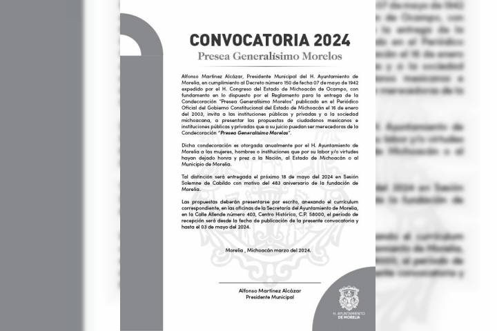 NOTICIAS 13/04/2024Participa y obtén la Presea Generalísimo MorelosEl Ayuntamiento de Morelia mantiene abierta la convocatoria para concursar por la Presea Generalísimo Morelos, reconocida como la máxima condecoración que hay en el municipio.