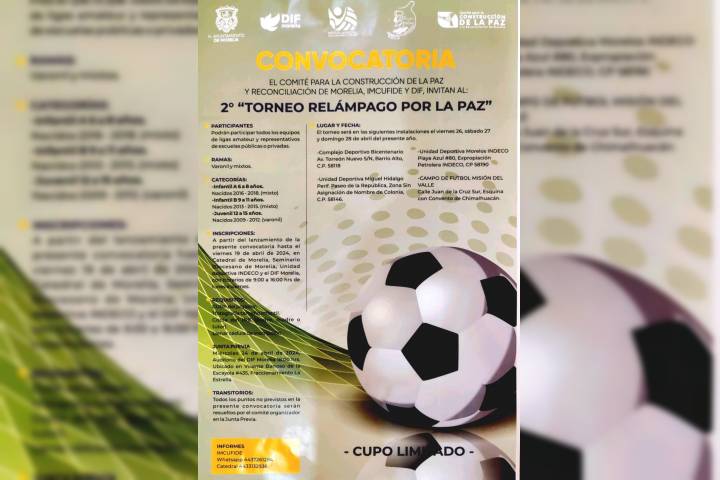 NOTICIAS 16/04/2024Invita Gobierno de Morelia a "2° Torneo Relámpago por La Paz" El Comité para la Construcción de la Paz y Reconciliación de Morelia y el Gobierno Municipal a través del IMCUFIDE y el DIF, invitan al 2° Torneo Relámpago por La Paz, el cual inicia inscripciones desde hoy martes 16 de abril, hasta el 19 para que participen todos los equipos y ligas amateur, así como representativos de las escuelas públicas o privadas en ramas varonil y mixtos.