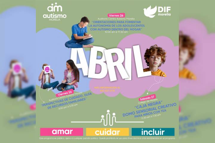 NOTICIAS 16/04/2024DIF Morelia invita a actividades "Creando Comunidad - Morelia incluyente"El DIF Morelia invita a familias, educadores, profesionales al cuidado de personas con autismo y a la comunidad en general, a participar este viernes 19 y sábado 20 de abril en una serie de actividades educativas y recreativas diseñadas para fomentar la inclusión y el apoyo a las familias con miembros en el Espectro Autista (TEA).