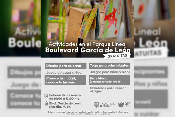 NOTICIAS 01/03/2024Este sábado, talleres y actividades lúdicas en el Boulevard García de León El DIF Morelia informa a la ciudadanía que este sábado 2 de marzo se impartirán talleres lúdicos, recreativos y deportivos en el Boulevard García de León. La jornada, programada de 10:00 am a 1:00 pm, incluye diversas actividades destinadas a fortalecer el tejido social y fomentar la salud y el bienestar de los asistentes.