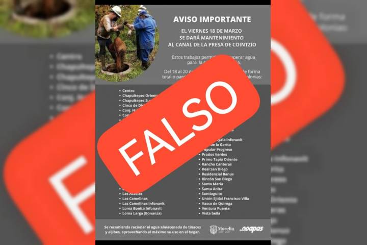 NOTICIAS 06/03/2024Falso aviso sobre suspensión de servicio de agua circula en redes socialesEl Organismo Operador de Agua Potable, Alcantarillado y Saneamiento de Morelia (OOAPAS), informa que circula en redes sociales un cartel de hace 4 años con un aviso de suspensión de agua en la ciudad, con lista de colonias, el cual está generando confusión entre la ciudadanía.
