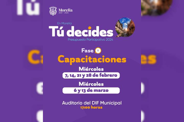 NOTICIAS 12/02/2024IMPLAN te capacita para la elaboración del proyecto para el Presupuesto Participativo 2024Asiste este 14 de febrero a la capacitación para participar en la Convocatoria Presupuesto Participativo 2024 "Tú decides", impartido por el Instituto Municipal de Planeación de Morelia (IMPLAN), donde se proporcionarán las herramientas necesarias a fin de elaborar un proyecto ciudadano, que concurse con otras ideas, con el objetivo de mejorar el equipamiento y la urbanización municipal.