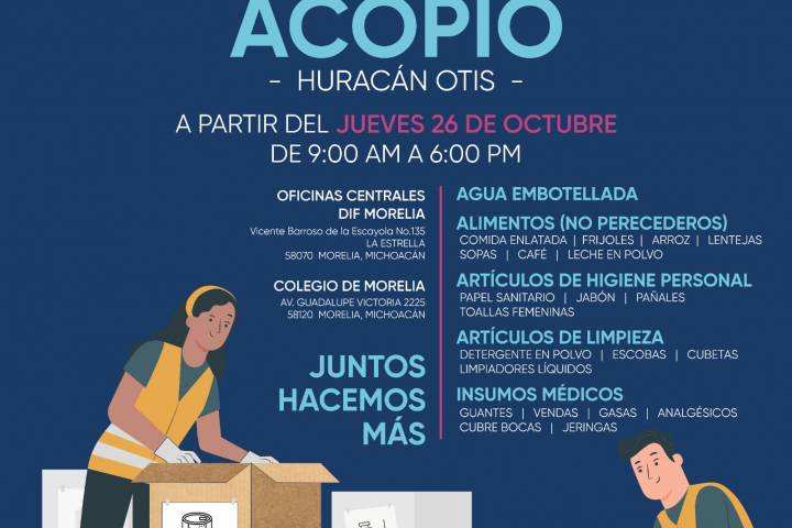 NOTICIAS 27/10/2023Gobierno Municipal continúa recibiendo víveres para afectados por Huracán OtisEl Gobierno de Morelia agradece a la ciudadanía por su apoyo y solidaridad hacia las comunidades afectadas por el devastador huracán Otis en el estado de Guerrero, e invita a las y los morelianos a seguir contribuyendo con su apoyo en los dos centros de acopio instalados para esta finalidad en las oficinas centrales del DIF Morelia y en el Colegio de Morelia, los cuales estarán habilitados durante este fin de semana, de 09:00 a 18:00 horas.