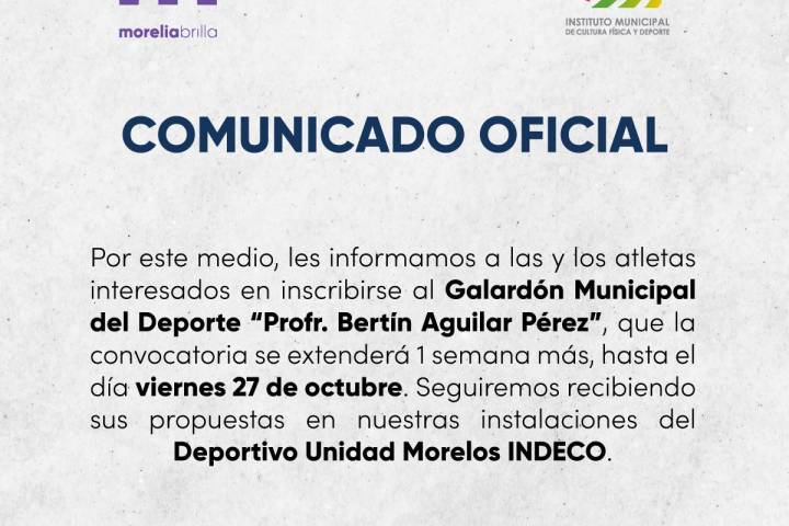 NOTICIAS 23/10/2023AmplÃa IMCUFIDE periodo de recepción de propuestas para el Galardón Municipal de DeporteEl Gobierno de Morelia, informa que se extendió el plazo de recepción de propuestas para contender por el Galardón Municipal del Deporte "BertÃn Aguilar Pérez", lo anterior con la finalidad de dar espacio a que las y los morelianos que se encuentran actualmente en competencia puedan ser considerados,