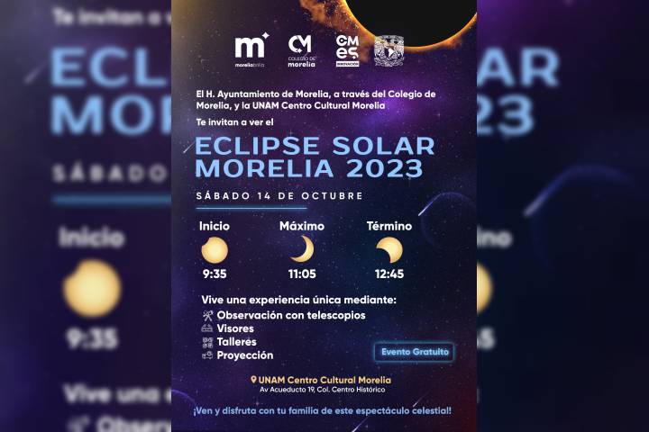 NOTICIAS 11/10/2023Gobierno de Morelia y UNAM invitan a vivir la experiencia de observar el eclipse de solGracias al gran interés que tiene el Presidente, Alfonso Martínez Alcázar de acercar a la población moreliana actividades relacionadas con la educación, la ciencia y la tecnología, el Gobierno Municipal a través del Colegio de Morelia, en coordinación con el Centro Cultural UNAM Morelia, invitan a la población en general a disfrutar del Eclipse Solar este sábado 14 de octubre 2023.