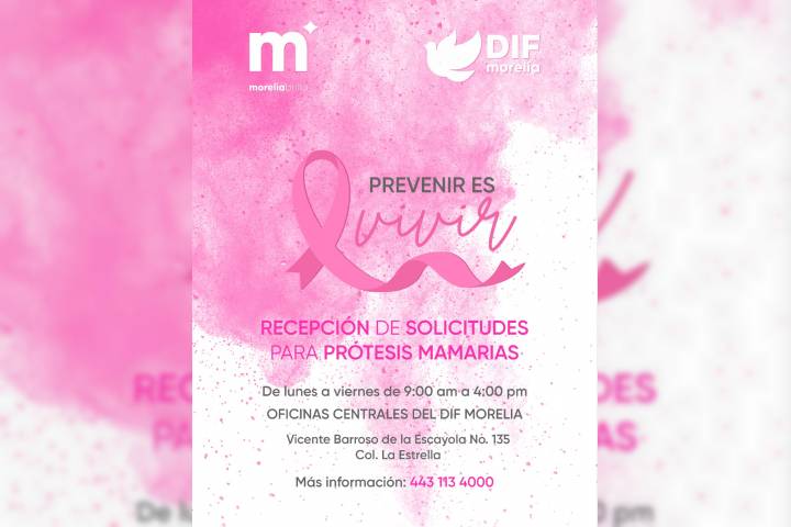 NOTICIAS 02/10/2023DIF Morelia abre la recepción de solicitudes de prótesis mamarias gratuitasEn un esfuerzo por acompañar a las mujeres de la ciudad que luchan o han luchado contra el cáncer de mama, el DIF Morelia, encabezado por la Presidenta Honoraria, Paola Delgadillo Hernández, abrirá durante este mes de octubre la recepción de solicitudes para prótesis mamarias gratuitas.