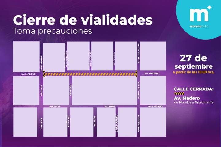 NOTICIAS 27/09/2023Cierres temporales por concierto de Aniversario de Morelos comenzarán este miércoles Morelia se prepara para festejar el Natalicio del Generalísimo José María Morelos y Pavón y por ello, el Ayuntamiento anunció que este miércoles comenzarán los cortes a la circulación en la avenida Madero, para el montaje del concierto que ofrecerá Gloria Trevi, el 29 de septiembre.