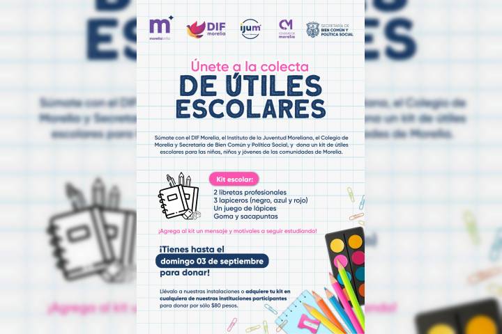 NOTICIAS 27/08/2023Gobierno de Morelia invita a fortalecer la educación y comunidad con la "Colecta por un Futuro Brillante" Con el firme respaldo del Presidente Municipal, Alfonso MartÃnez Alcázar, el Gobierno de Morelia impulsa la iniciativa "Colecta por un Futuro Brillante" con el fin de reforzar la educación de calidad y accesible para todos, centrándose en las comunidades más apartadas de la ciudad. Este programa no sólo busca dotar de útiles escolares a quien más lo necesita, sino que también apunta a reforzar el sentido de comunidad y el compromiso cÃv... Ver más...