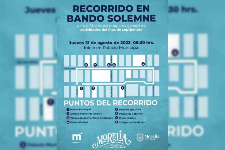 NOTICIAS 30/08/2023Anuncia Ayuntamiento de Morelia cierres a la circulación por recorrido en Bando Solemne Con el objetivo de que la ciudadanÃa tome sus precauciones y opte por vÃas alternas para circular el jueves 31 de agosto del presente, el Ayuntamiento de Morelia anunció a las y los morelianos los cortes a la circulación que se tendrán en Avenida Madero, desde Andrés Quintana Roo hasta Juan José de Lejarza, y calles aledañas para el recorrido en Bando Solemne que iniciará al filo de las 8:30 horas.