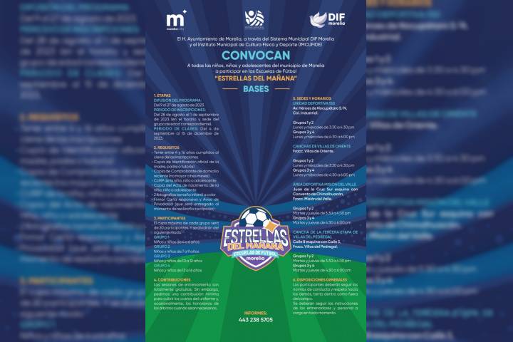 Del 28 al 1 de septiembre abrirán las inscripciones de las Escuelas de Fútbol "Estrellas del Mañana" que impulsa el Ayuntamiento, a través del DIF Morelia que encabeza la Presidenta, Paola Delgadillo Hernández, como un programa que pretende fortalecer el acercamiento de la juventud con su comunidad y promover su desarrollo integral. La iniciativa del DIF Morelia y el Instituto Municipal de Cultura Física y Deporte (IMCUFIDE), se enfoca...