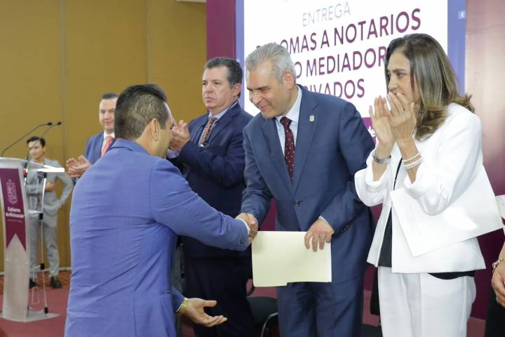NOTICIAS 27/04/2023Entrega Bedolla certificación a Notarios como conciliadoresAl encabezar la entrega de certificados a un 25 por ciento de los Notarios Públicos de Michoacán como mediadores privados, el gobernador Alfredo Ramírez Bedolla, resaltó la labor que estarán efectuado para alcanzar soluciones favorables en litigios civiles y evitar llegar a juzgados, ahorrando tiempo y dinero.