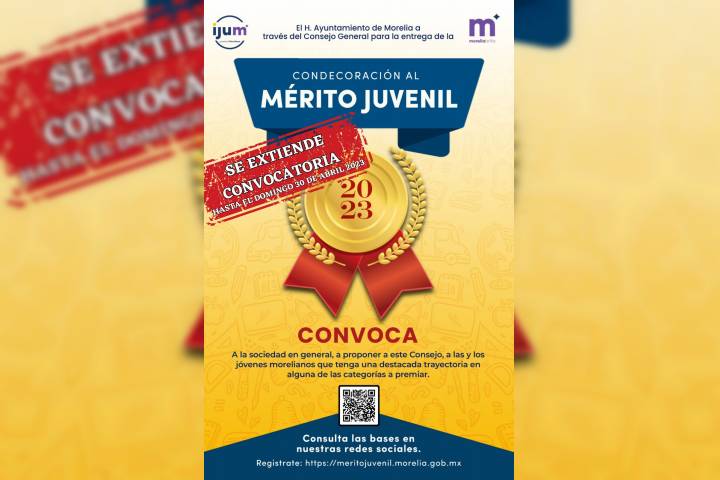 NOTICIAS 24/04/2023Se extiende fecha para participar en la convocatoria al Mérito JuvenilCon la finalidad de que las y los jóvenes que aún tienen el deseo de participar en la convocatoria Condecoración al Mérito Juvenil 2023 y que no alcanzaron a realizar su registro antes del 23 de abril, el Instituto de la Juventud Moreliana (IJUM), informa que se extiende la fecha hasta el próximo 30 de abril del presente año.